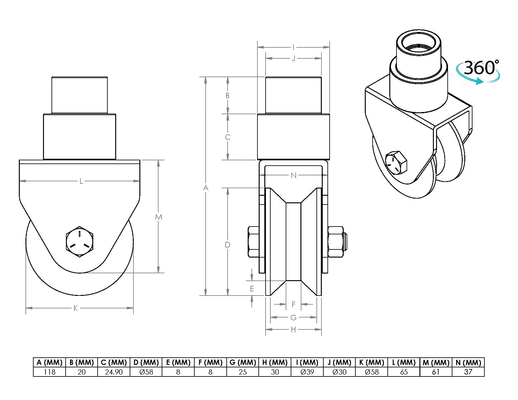 360° Rotating wheel : 58mm roller dia, 150kg capacity